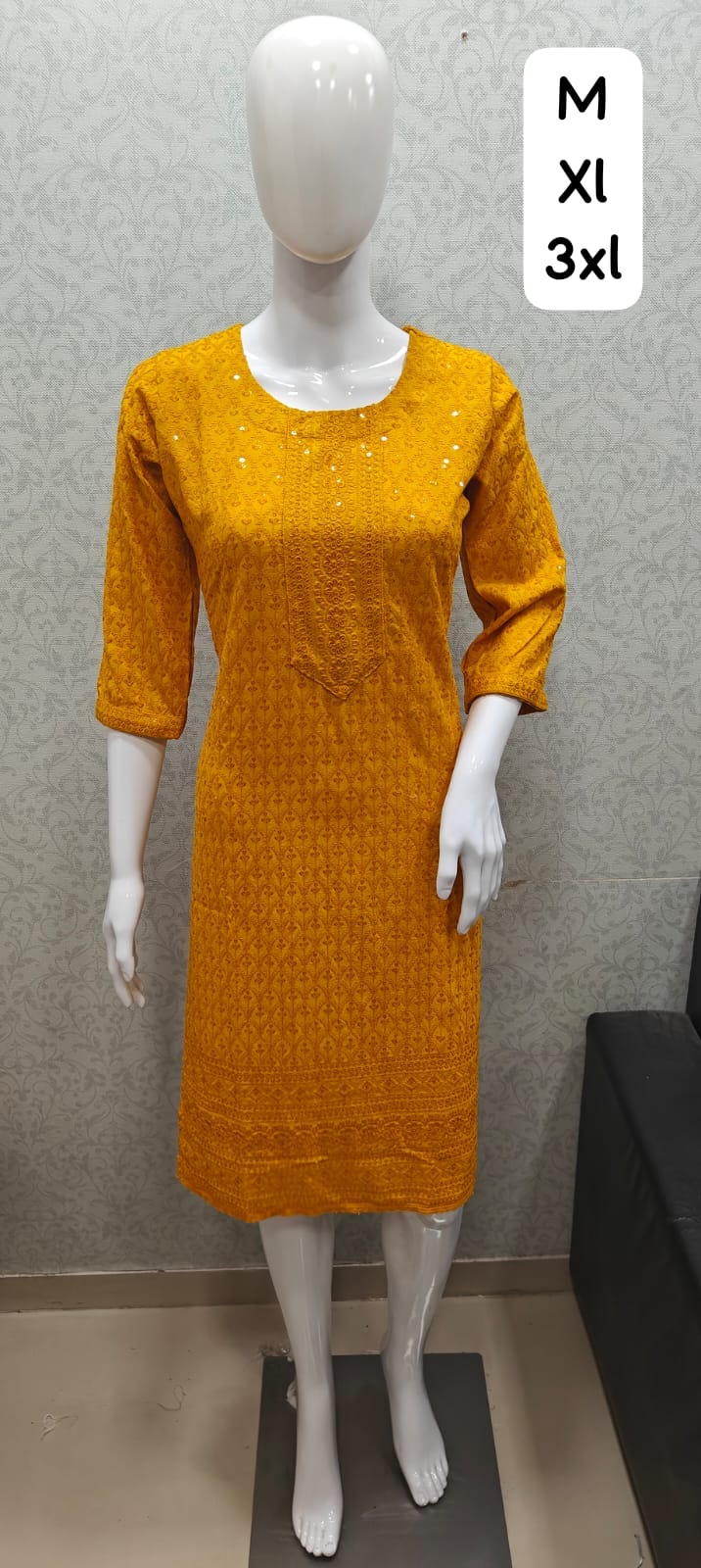 This beautiful set of embroidered cotton straight kurtis in mustard, white, and maroon is a versatile essential for every ethnic wardrobe. Crafted in breathable cotton fabric with intricate self-embroidery and delicate sequin mirrorwork, these kurtis are perfect for both casual wear and festive gatherings.