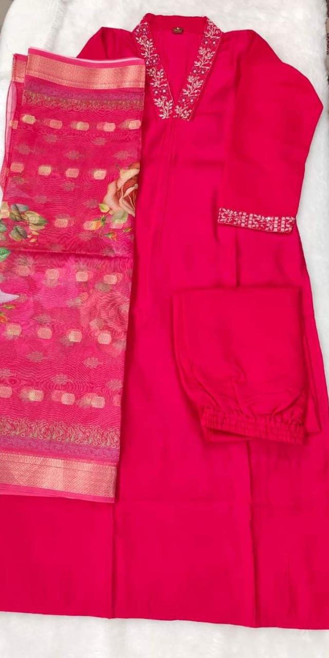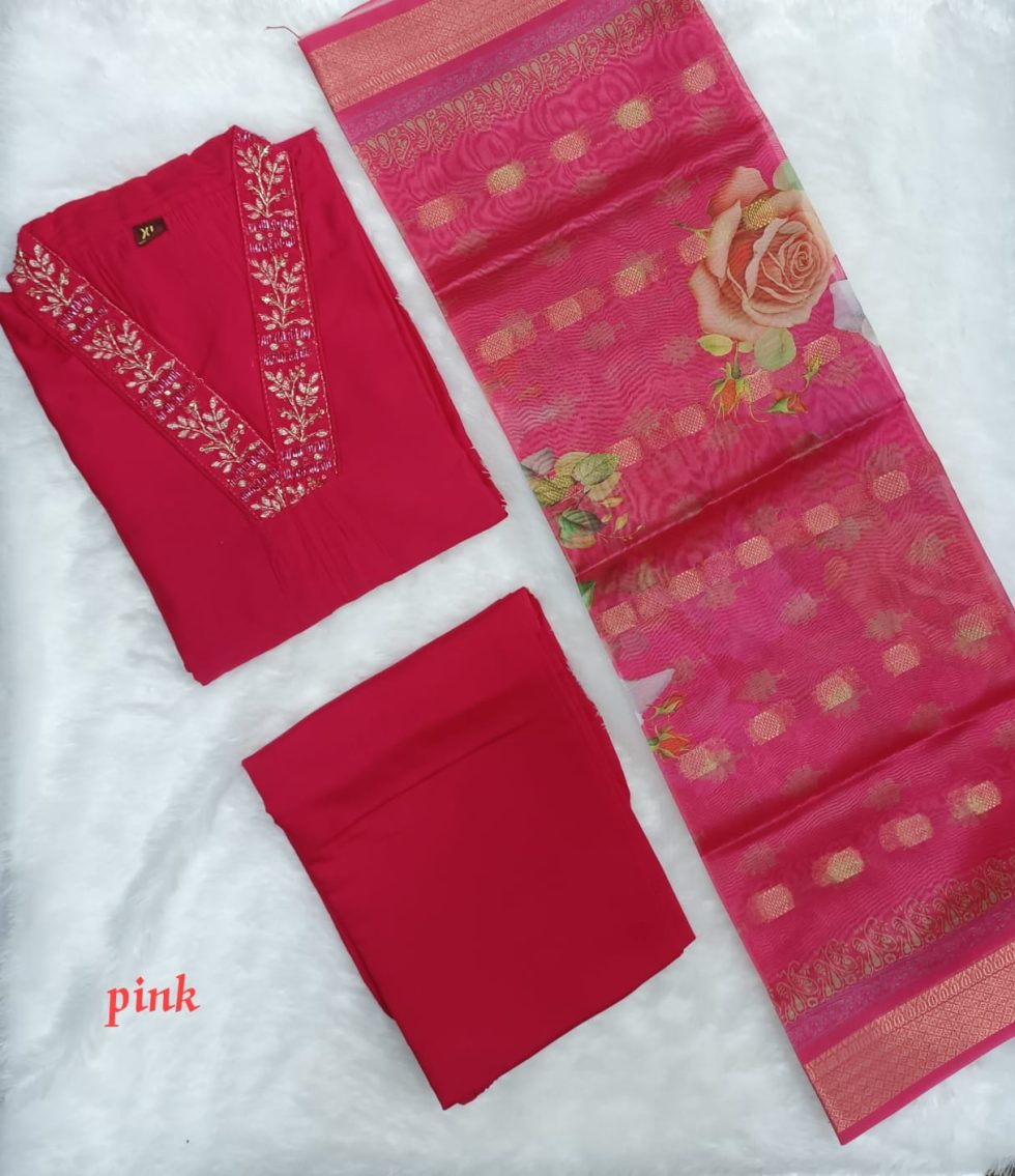 A timeless blend of ethnic charm and everyday elegance, this 3-piece unstitched kurti set includes a soft rayon kurti top, bottom fabric, and a floral motif printed dupatta. Available in Pink and Wine colorways with intricate thread embroidery on the neckline for a festive yet functional appeal.