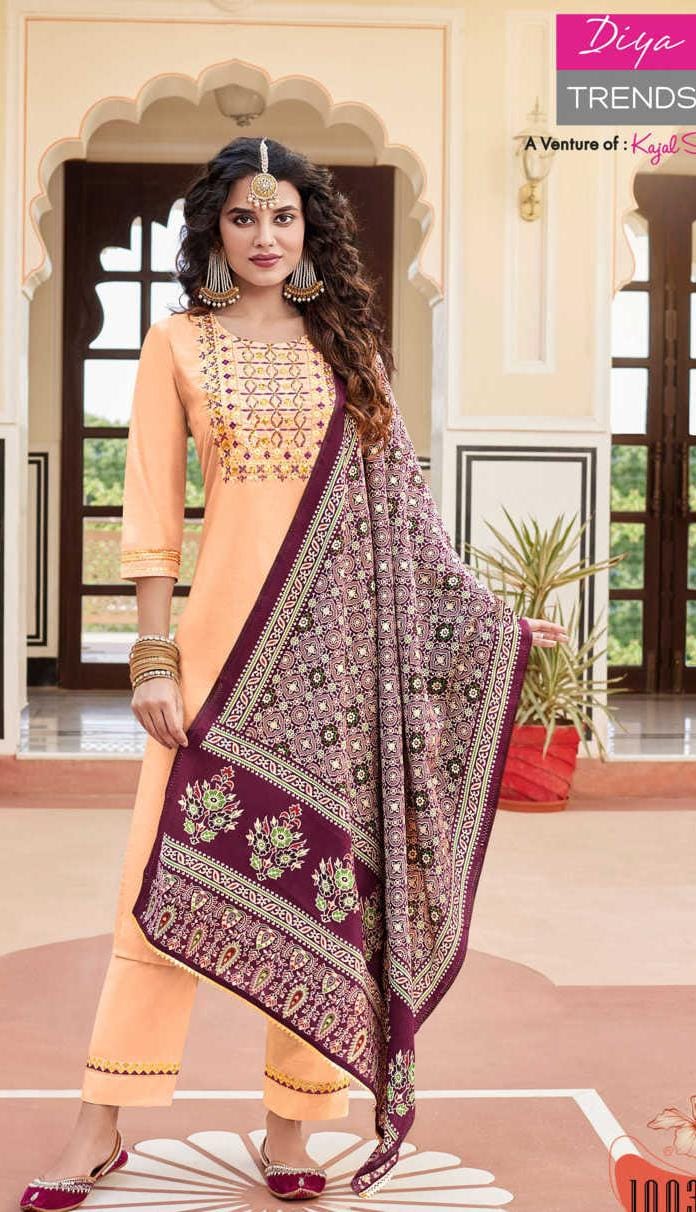 The set includes a comfortable matching pant, tailored for a refined look, and is beautifully paired with a vibrant Leheriya dupatta that adds a splash of color and movement to the ensemble.
