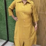 The kurta is tailored with a sleek shirt-style collar, full-length silhouette, and functional side pockets, making it a versatile choice for workwear, casual outings, or travel. The mustard yellow hue adds a warm, earthy charm, while the vertical fabric texture lends a refined, elongating effect to the overall look.