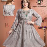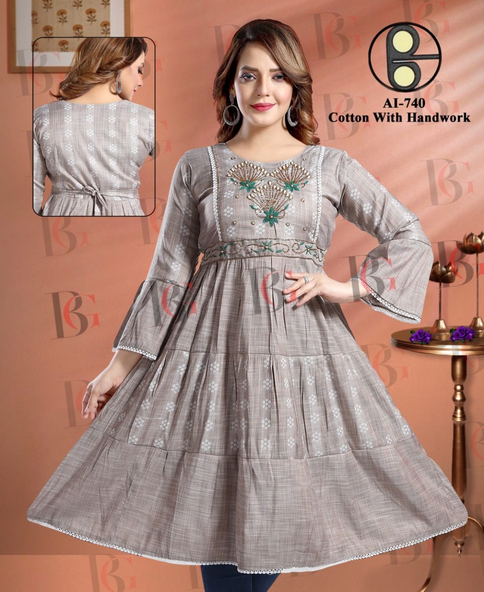 Make a sophisticated statement with this beautifully designed grey flared kurti from our premium collection. Crafted in soft cotton fabric and highlighted with delicate hand embroidery, this piece combines traditional elegance with modern charm. The flared silhouette, fine pleats, and bell sleeves add a graceful movement and flow to your outfit.
