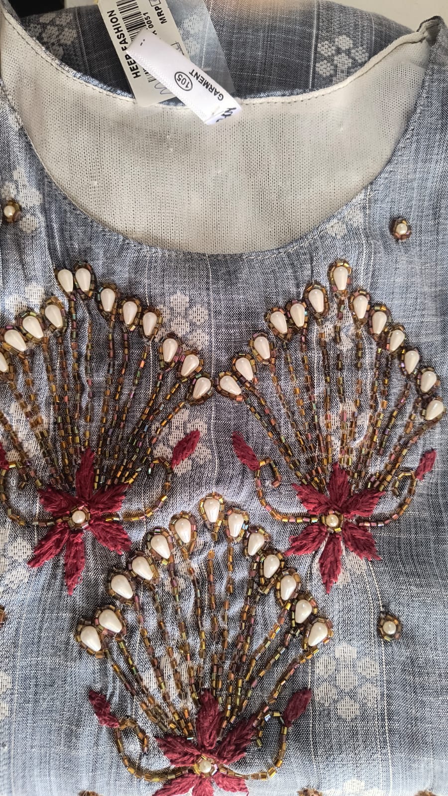 Embroidery: Intricate handwork in the front yoke – floral and abstract motifs