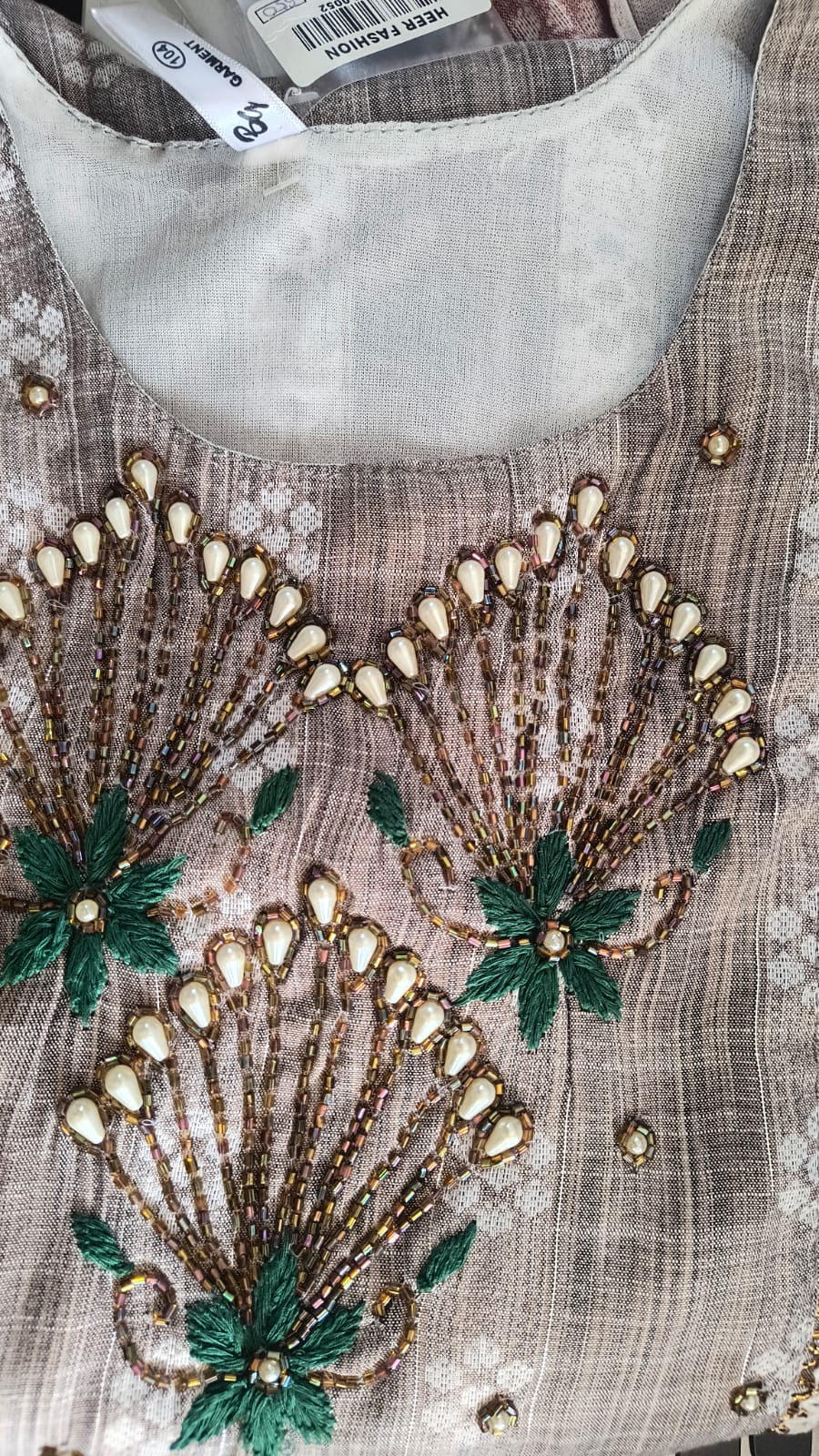 Muted Warm Grey with White, Green, and Golden Hand Embroidery Accents