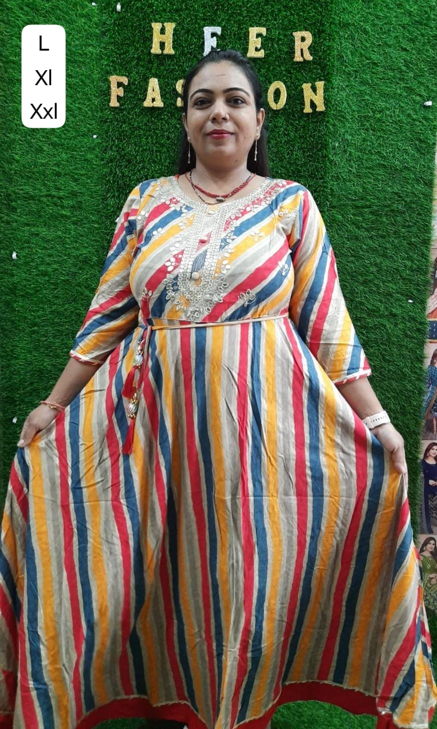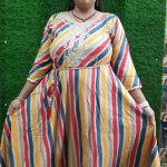 Step into effortless elegance with this multicolor vertical striped Anarkali kurti from Heer Fashion. Crafted from soft, breathable cotton-blend fabric, this kurti features vibrant vertical stripes in mustard yellow, royal blue, deep red, and ivory that elongate the silhouette and provide a flattering look. The neckline is intricately adorned with floral thread and mirror embroidery, adding a festive touch. Perfect for casual outings, ethnic events, or office wear.