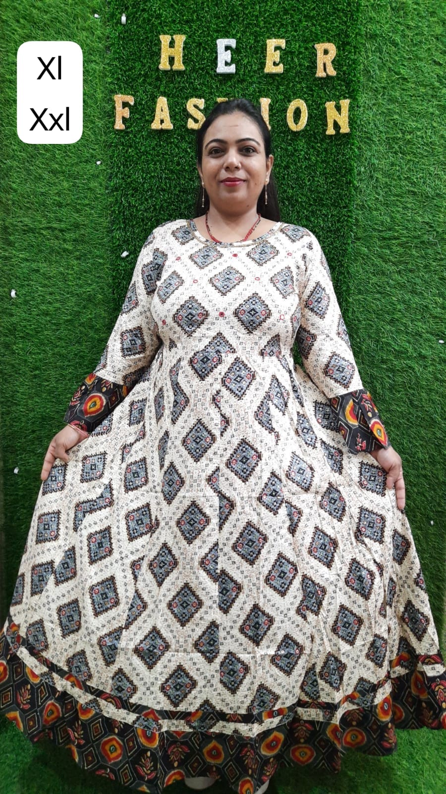 Make a bold yet traditional statement with Heer Fashion’s Cream and Black Ethnic Printed Gown, crafted for women who love fusion wear that’s vibrant, flattering, and easy to carry. The gown features an all-over geometric tribal-inspired print on a cream base, contrasted beautifully with multi-color ethnic border work on the cuffs and hem. It’s perfect for festive occasions, cultural events, or casual ethnic daywear.