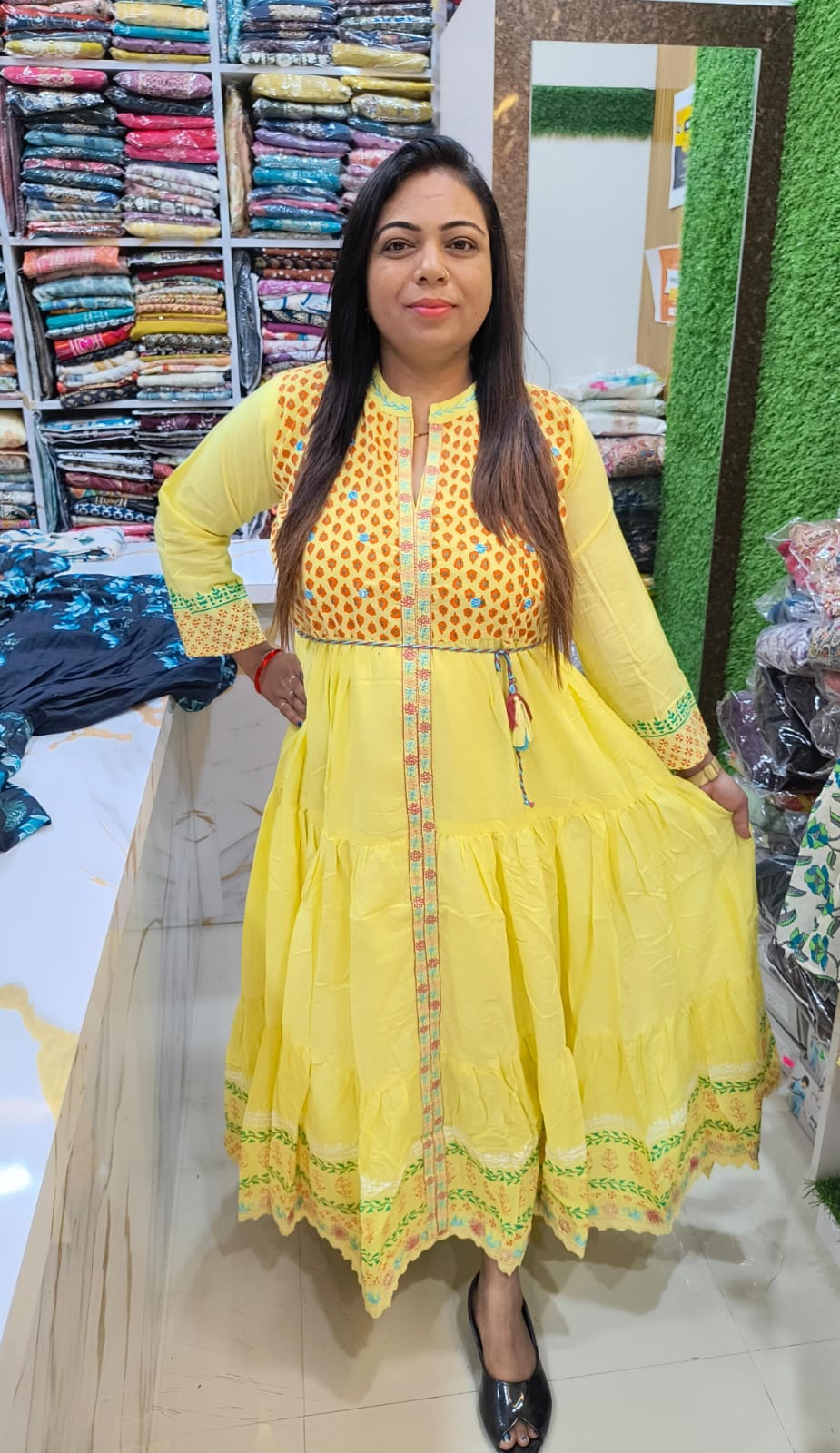 Radiate brightness and charm with this stunning yellow Anarkali kurti gown, designed to blend traditional motifs with contemporary ease. This floor-length beauty is crafted from soft cotton fabric, ensuring breathability and comfort throughout the day.