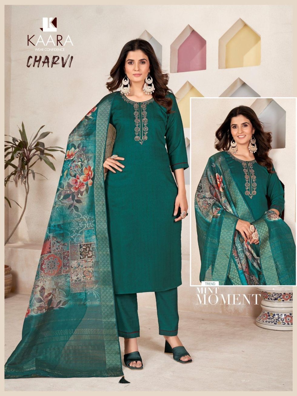 Step into sophistication with the KAARA Charvi collection, a perfect blend of traditional structure and modern digital artistry. The beautifully embroidered neckline, paired with a digitally printed dupatta that features florals and heritage motifs, makes this set ideal for festive brunches, intimate gatherings, and cultural events.
