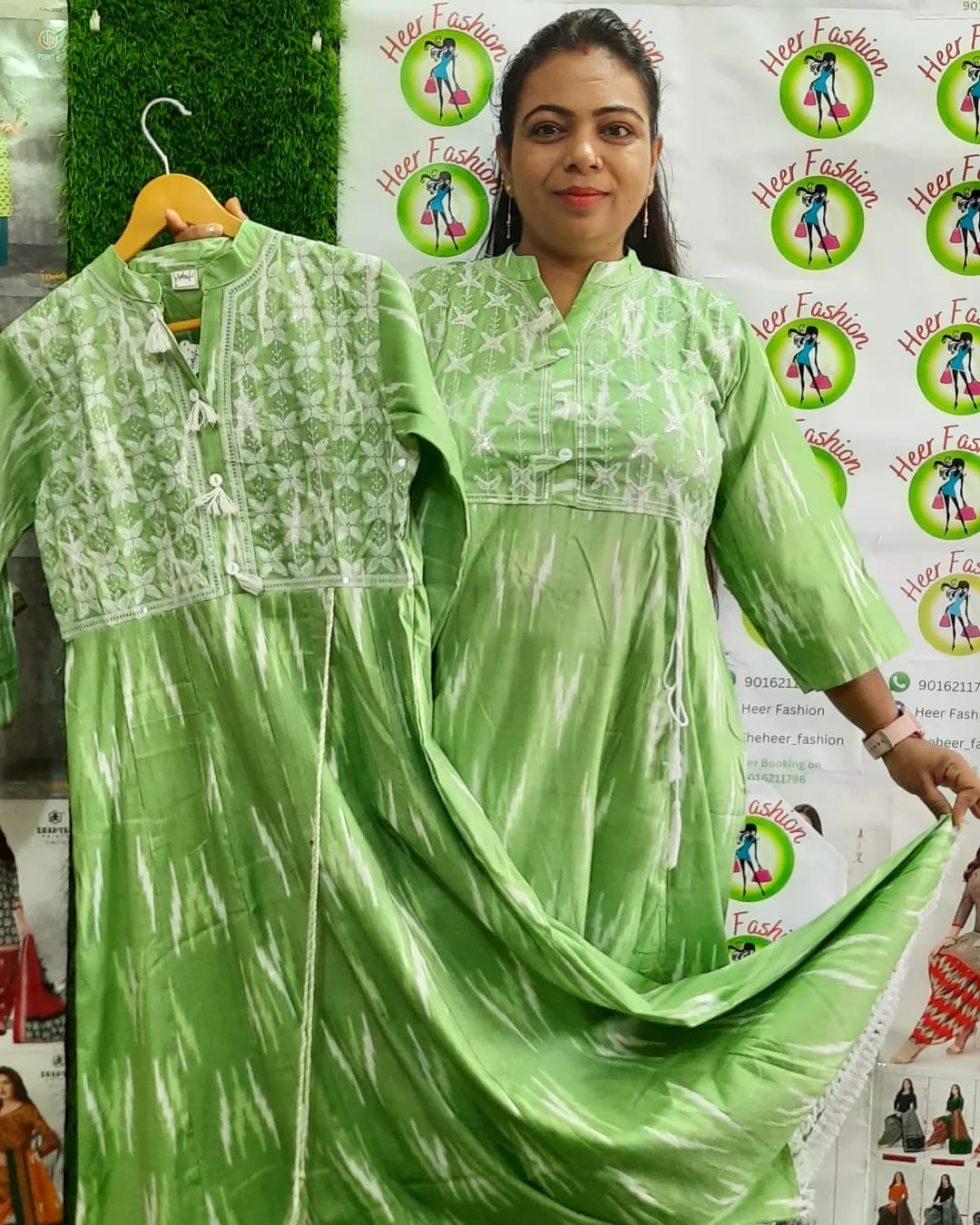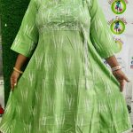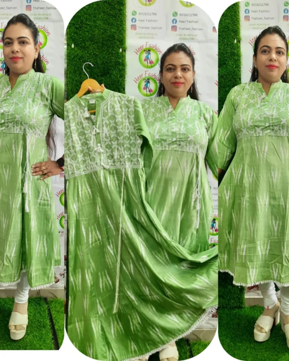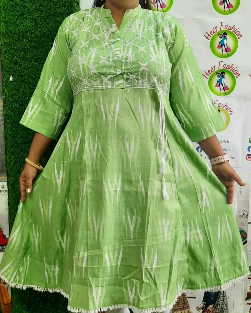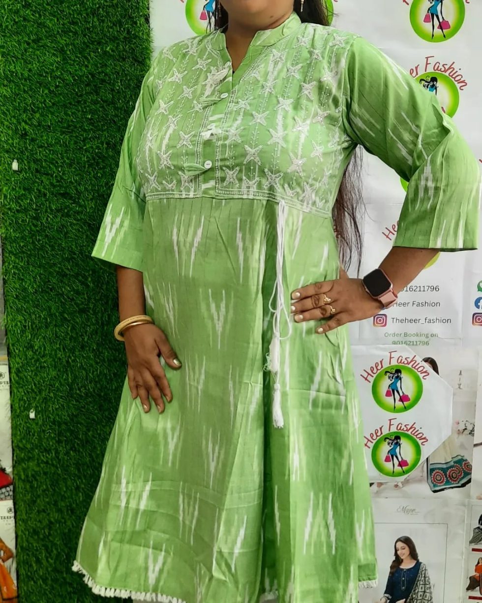 Bring comfort and style together with this refreshing Light Green Flared Kurti, adorned with traditional Ikat print and elegant white thread embroidery. The design features a flattering flared silhouette with soft gathers and a chic tasseled dori at the side, perfect for casual days, office wear, or festive simplicity.