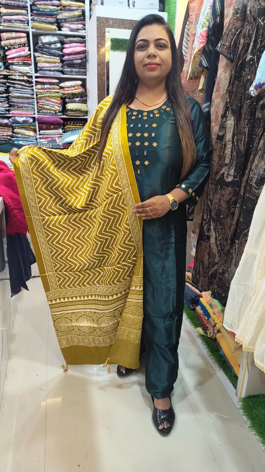 Front panel features vertical buti-style mirror motifs