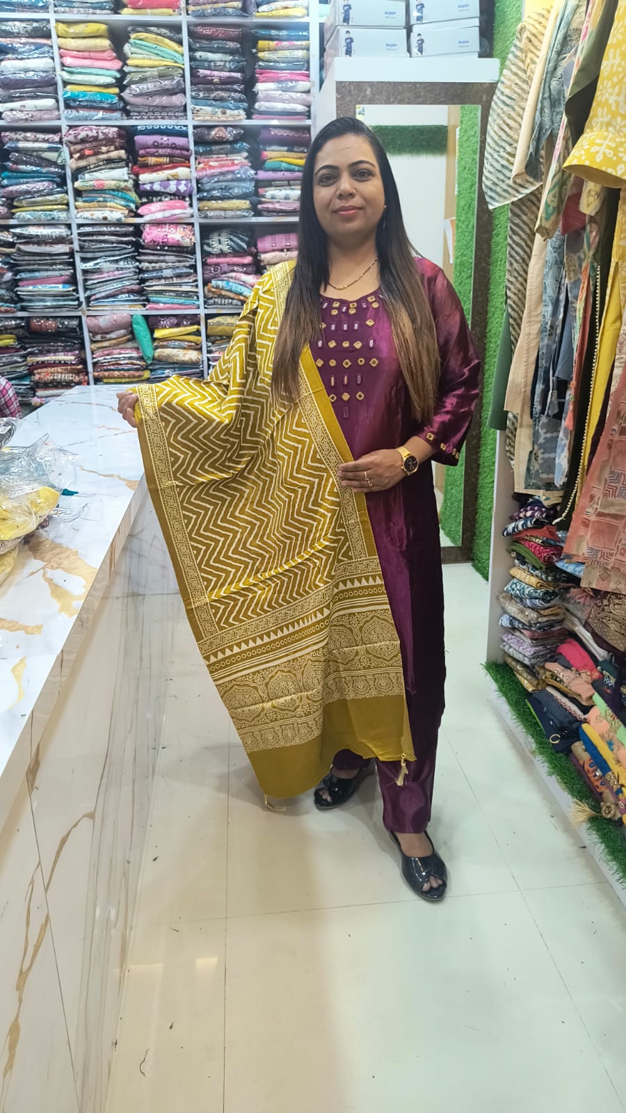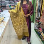 Make a graceful style statement with this striking wine-purple 3-piece ethnic suit set, highlighted by a contrast mustard yellow dupatta in traditional zigzag and border print. Designed to combine elegance with comfort, this ensemble is perfect for festivals, family functions, and cultural gatherings.